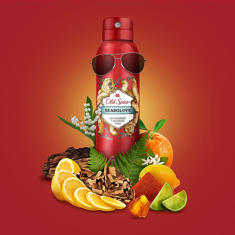 اسپری دئودورانت اولد اسپایس بیرگلاو Old Spice Bearglove محافظت کننده 48 ساعته خشکی و تازگی زیر بغل به همراه تکنولوژی مقاومت در برابر محو شدن رایحه جهت حس شادابی و تازگی طولانی مدت می باشد. اسپری بیرگلاو همچنین حاوی رایحه پرتقال، لیمو، لیموی سبز، زعفران، کهربا، گل زنبق دره، شکوفه پرتقال، گلسنگ و رایحه های چوبی است و حس شادابی طولانی مدت را به ارمغان می آورد.