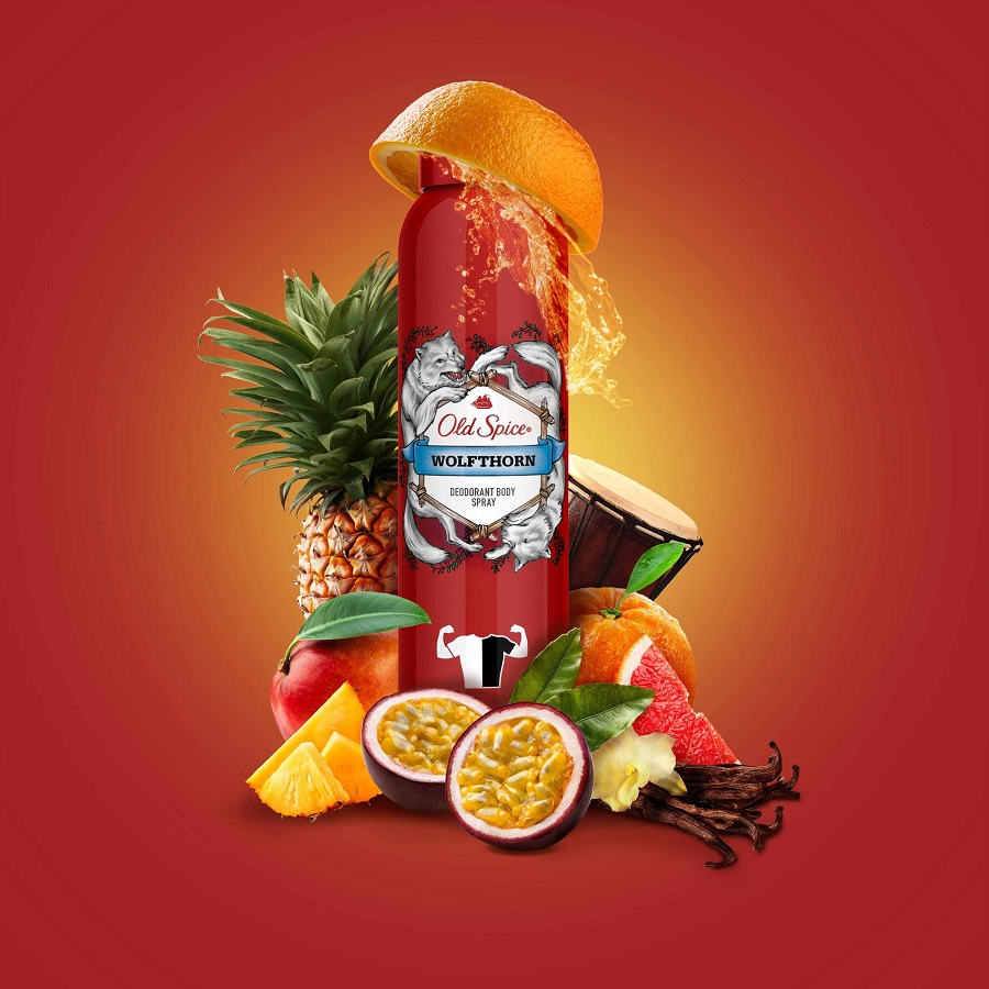 اسپری دئودورانت اولد اسپایس ولفتورن Old Spice Wolfthorn محافظت کننده 48 ساعته خشکی و تازگی زیر بغل به همراه تکنولوژی مقاومت در برابر محو شدن رایحه جهت حس شادابی و تازگی طولانی مدت می باشد. اسپری دئودورانت ولفتورن همچنین حاوی رایحه پشن فروت، وانیل، آناناس، انبه و پرتقال توسرخ می باشد.