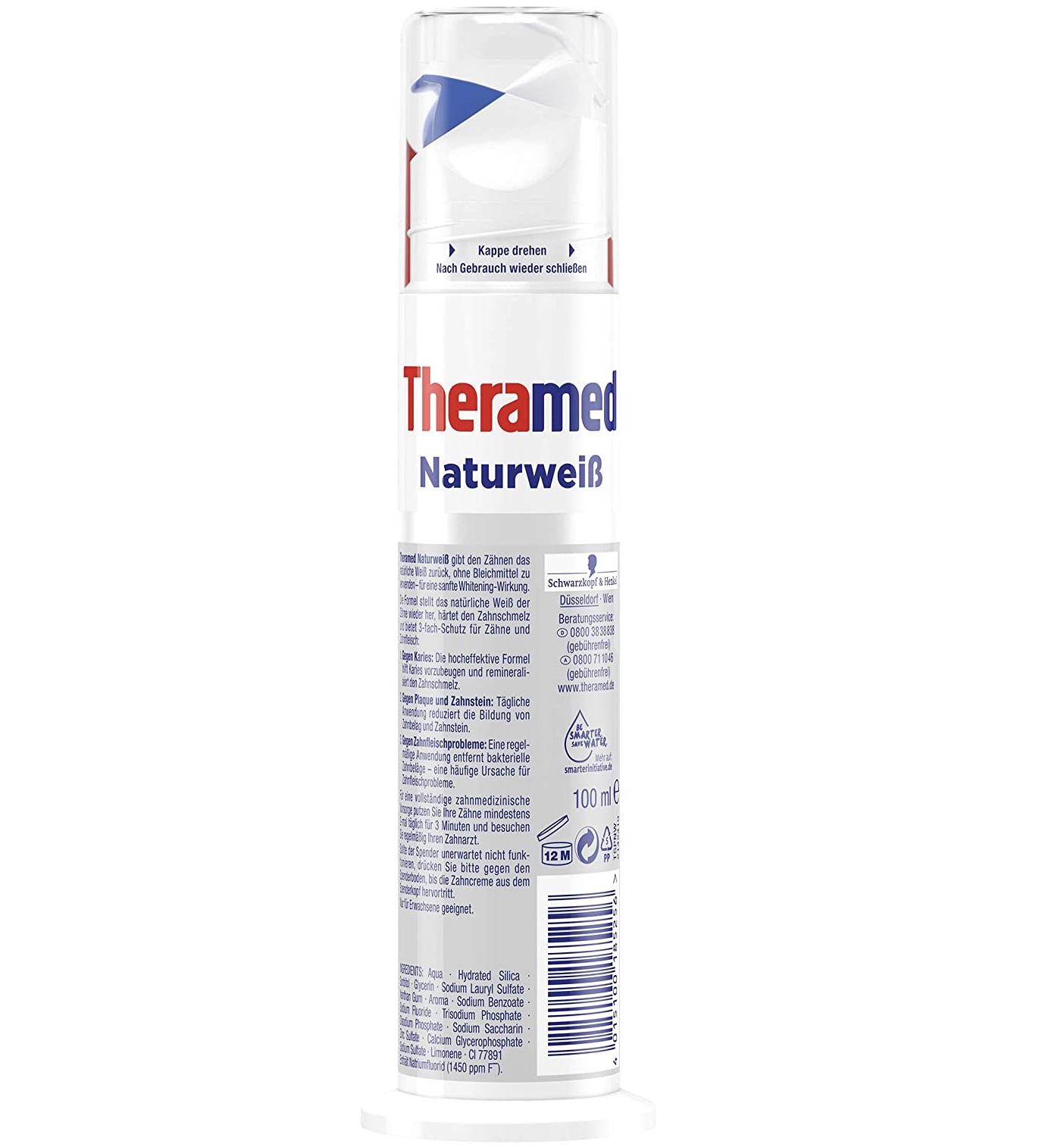خمیردندان پمپی سفیدکننده ترامد Theramed Natur Weiss حاوی میکرو ذرات پاک کننده دندان به همراه فرمول فلوراید بهینه شده جهت بازگرداندن سفیدی طبیعی دندان می باشد. خمیردندان ترامد تازگی بخش قوی تنفس است و دارای سه عملکرد جلوگیری از پوسیدگی دندان، مقابله با ایجاد پلاک و جرم های دندانی و از بین برنده باکتری های ایجاد کننده پلاک به عنوان عامل ایجاد کننده مشکلات لثه می باشد.