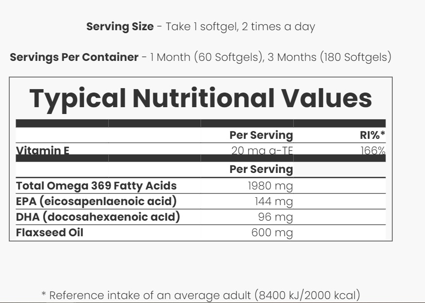 مکمل امگا 369 مای ویتامینز Myvitamins Omega 3 6 9 حاوی میزان متعادلی از اسیدهای چرب امگا با منشاء طبیعی است. امگا 3 یکی از اسیدهای چرب ضروری بدن است که متشکل از EPA و DHA می باشد، EPA و DHA می تواند به سلامت قلب و فشار خون ما کمک کند. آن ها همچنین منبع خوبی از آنتی اکسیدان و ویتامین E هستند.