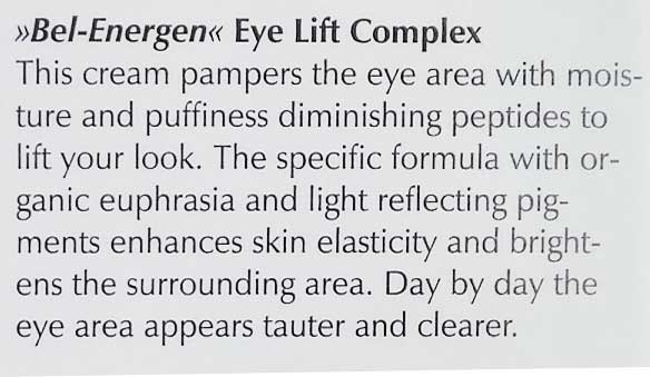 کرم لیفتینگ دور چشم دکتر بلتر Dr Belter Eye Lift Complex حاوی ترکیبی از عصاره های طبیعی باکیفیت به همراه فناوری پیشرفته کمپلکس های نوآورانه جهت افزایش سفتی و لیفتینگ دور چشم، کاهش پف زیر چشم، کاهش ناحیه تیره دور چشم و آبرسانی آن می باشد. کرم دور چشم دکتر بلتر حاوی عصاره ارگانیک گل ایفرازیا Euphrasia با خواص روشن کنندگی دور چشم و مواد موثر بازتاب دهنده نور جهت ایجاد نمای هموارتر و یکدست می باشد. دیگر مواد موثر فعال این ترکیب شامل کمپلکس پپتید Gemmodrain جهت کاهش پف چشم، ویتامین E برای مقابله با رادیکال های آزاد، روغن جوجوبا جهت تغذیه پوست و عصاره زنجبیل با خواص انرژی بخشی می باشد، در نتیجه پوست دور چشم روز به روز سفت تر و شفاف تر می شود و حس آسودگی کامل را به ارمغان می آورد.