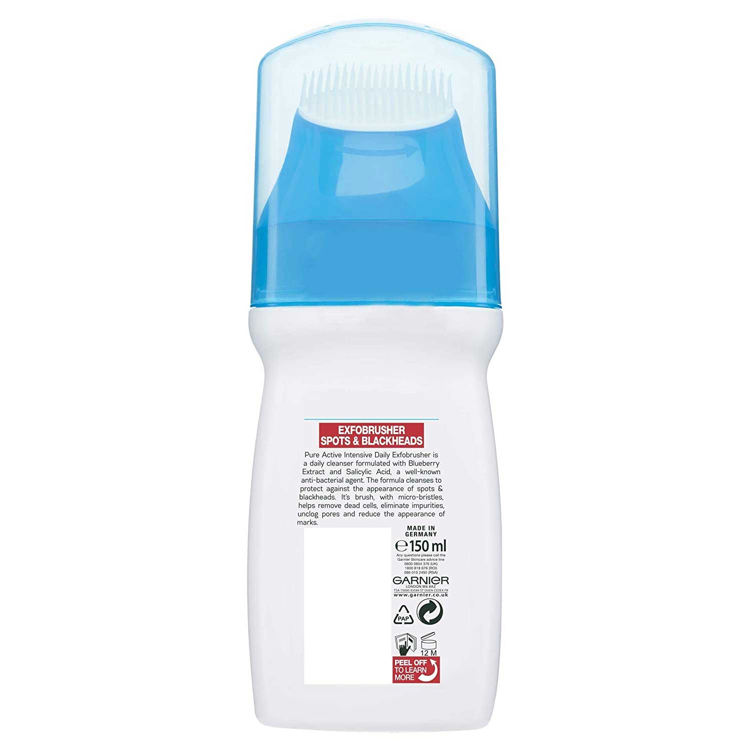 ژل پاک کننده پوست چرب و جوشدار گارنیه Garnier Pure Active Exfobrusher دارای نازل با طراحی نوآورانه به صورت برس با 170 تار بسیار نرم و منطعف جهت پاک کنندگی عمیق و ملایم و پاکسازی منافذ پوست می باشد. ژل پاک کننده گارنیه حاوی عصاره بلوبری و 2 درصد سالیسیلیک اسید به عنوان آنتی باکتریال جهت رفع عوامل جوشزا و مقابله با ایجاد جوش می باشد. این فرمول چربی اضافی منافذ پوست را به خوبی پاک کرده، جای جوش را کاهش داده و پوستی تمیز و بدون براقیت را به ارمغان می آورد.
