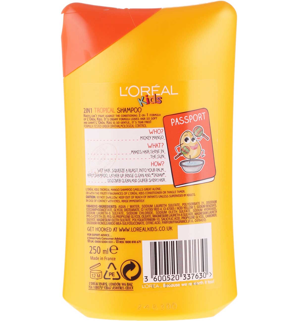 شامپو 2 در 1 کودک لورال رایحه انبه LOreal Tropical Mango دارای فرمول بسیار ملایم و حاوی شامپو و نرم کننده با رایحه خوشمزه بسیار میوه ای است. شامپو کودک لورال چشم را نمی سوزاند و موها را فوق العاده نرم و خوشبو می کند.