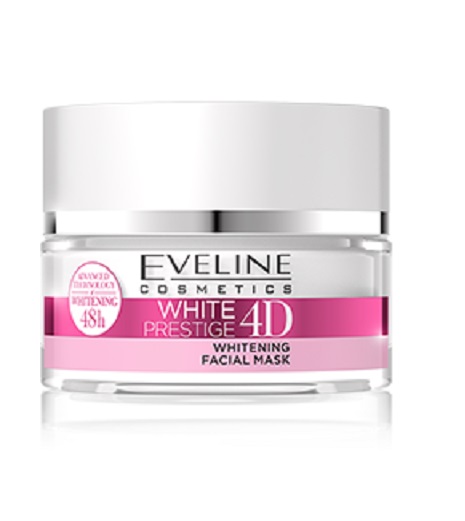 ماسک روشن کننده صورت اولاین وایت پرستیژ Eveline White Prestige 4D دارای فناوری الهام گرفته از لیزر درمانی جهت افزایش روشنایی پوست در چهار بعد شامل: روشن کنندگی پوست، افزایش شفافیت پوست، جلوگیری از ایجاد لک و بهبود شرایط کلی پوست می باشد. ماسک روشن کننده وایت پرستیژ حاوی فناوری FRACTO2 ILLUMI LASER عمل کننده حرفه ای مانند لیزر درمانی به همراه کمپلکس Lumiwhite جهت روشن کنندگی، هموار کنندگی و کاهش لک پوست است. علاوه بر این هیالورونیک اسید جهت آبرسانی قوی و خاک رس سفید با خواص روشن کنندگی، مات کنندگی و تسکین پوست به این ترکیب اضافه شده است.