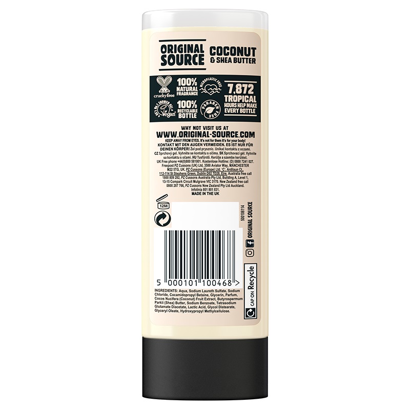 ژل دوش نارگیل استوایی و شی باتر اورجینال سورس Original Source Tropical Coconut محصولی باکیفیت و حاوی عصاره طبیعی جهت احساس حضور در بهشت استوایی گرمسیری می باشد. اورجینال سورس اینگونه توضیح می دهد: ما 7872 ساعت گرمسیری منتظر ماندیم تا نارگیلهایمان را به خوبی برسانیم و سپس آنها را با شی باتر فشرده کنیم و در هر بطری شامپو بدن قرار دهیم. این فرمول ضمن تغذیه پوست، از خشکی پوست جلوگیری می کند و احساس پوستی لطیف و نرم را به ارمغان می آورد.