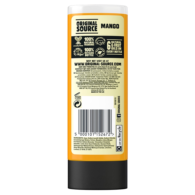 ژل دوش انبه اورجینال سورس Original Source Juicy Mango محصولی باکیفیت و حاوی عصاره طبیعی بدست آمده از انبه با خواص تغذیه کنندگی و نرم کنندگی پوست می باشد. شش نوع روغن طبیعی و میوه ای با رایحه کاملا طبیعی در ژل دوش انبه اورجینال سورس قرار گرفته و حس دلپذیر حضور در طبیعت را به همراه پوستی تمیز و لطیف به ارمغان می آورد.
