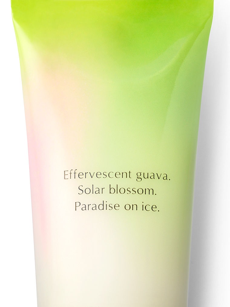 لوسیون بدن ویکتوریا سکرت تروپیکال اسپریتز Tropical Spritz با رایحه دلپذیر گواوا و شکوفه های آفتابی و تم بهشت بر روی یخ آبرسان و رطوبت رسان 24 ساعته پوست می باشد. لوسیون بدن ویکتوریا سکرت حاوی آلوئه ورا، شی باتر، روغن نارگیل، ویتامین C، ویتامین E و آنتی اکسیدان بوده و استفاده از آن علاوه بر تغذیه و آبرسانی پوست حس بسیار خوشایندی به همراه دارد.