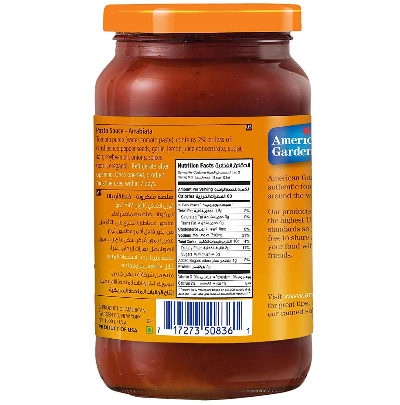 سس پاستای اربیاتا امریکن گاردن American Garden Arrabiata تهیه شده از مواد اولیه طبیعی باکیفیت و با بالاترین استانداردهای آمریکا بوده و طعم بسیار خوبی به غذا می دهد. سس اربیاتا نوعی سس ایتالیایی از منطقه لاتزیو ایتالیا است که از سیر، گوجه فرنگی و فلفل چیلی قرمز خشک شده و پخته شده در روغن زیتون فراوان بدست می آید.