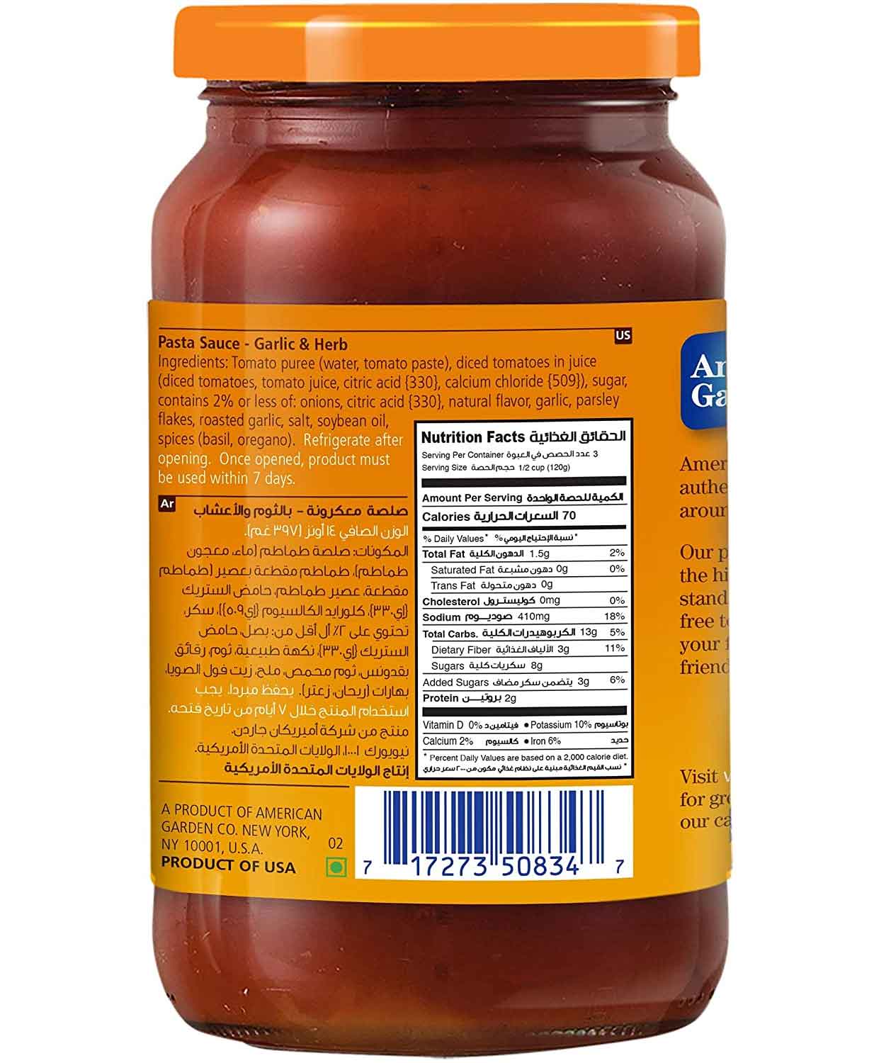 سس پاستای سیر و سبزیجات امریکن گاردن American Garden Garlic Herb تهیه شده از مواد اولیه طبیعی باکیفیت و با بالاترین استانداردهای آمریکا بوده و طعم بسیار خوبی به غذا می دهد.