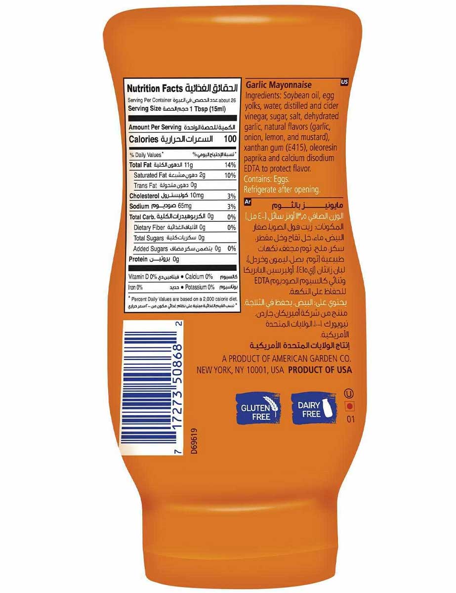 سس مایونز سیر امریکن گاردن American Garden Garlic Mayonnaise تهیه شده از باکیفیت ترین مواد طبیعی تحت استانداردهای روز آمریکا و بدون رنگ و طعم دهنده مصنوعی می باشد.