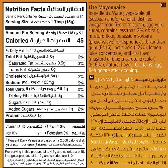 سس مایونز سبک امریکن گاردن American Garden Light Mayonnaise تهیه شده از باکیفیت ترین مواد طبیعی و 59 درصد چربی کمتر، تحت استانداردهای روز آمریکا و بدون رنگ و طعم دهنده مصنوعی می باشد.