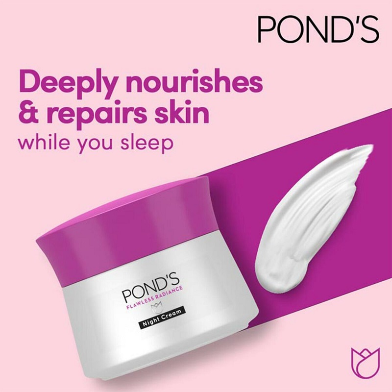 کرم ضدلک و روشن کننده شب پوندز فلولس رادیانس Ponds Flawless Radiance دارای فرمول ویژه به همراه تکنولوژی Gen-Activ جهت افزایش روشنایی و شفافیت پوست طی 7 روز می باشد. کرم فلولس وایت پوندز حاوی پرو ویتامین B3 (نیاسین آمید) جهت افزایش روشنایی و سفیدی پوست است، علاوه بر این تکنولوژی Gen-Activ برای تنظیم و انطباق با DNA تولید کننده ملانین (لک و نقاط تیره) و روشن کنندگی عمقی پوست از لایه های زیرین آن است که محصولی کاربردی را حاصل شده است.