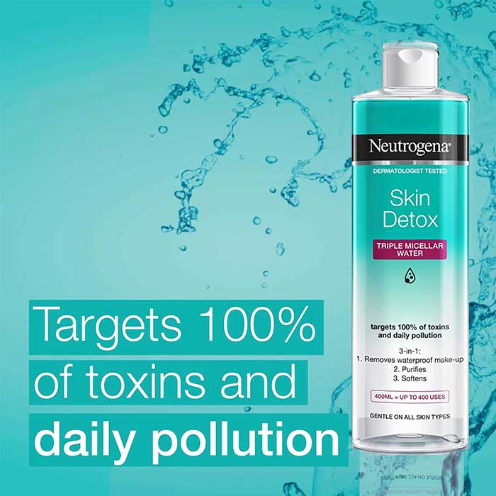 میسلار واتر پاک کننده آرایش و سم زدای نوتروژنا اسکین دیتوکس Skin Detox دارای فرمول نوآورانه است که ترکیبی از سه نوع ملکول های میسلار عمل کننده مانند آهنربا جهت پاک کردن انواع آرایش از جمله آرایش ضدآب مژه ها و تصفیه عمیق پوست با حفظ تعادل رطوبت صورت می باشد. میسلار واتر اسکین دیتوکس ضمن پاکسازی کامل سموم و آلودگی های محیطی، بر روی انواع پوست ملایم بوده و احساس پوستی تمیز، نرم و لطیف را به ارمغان می آورد.