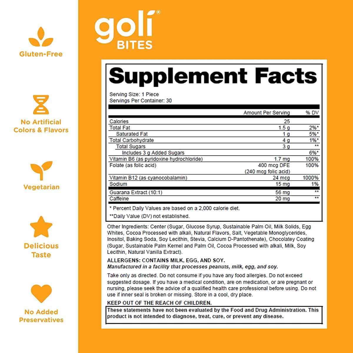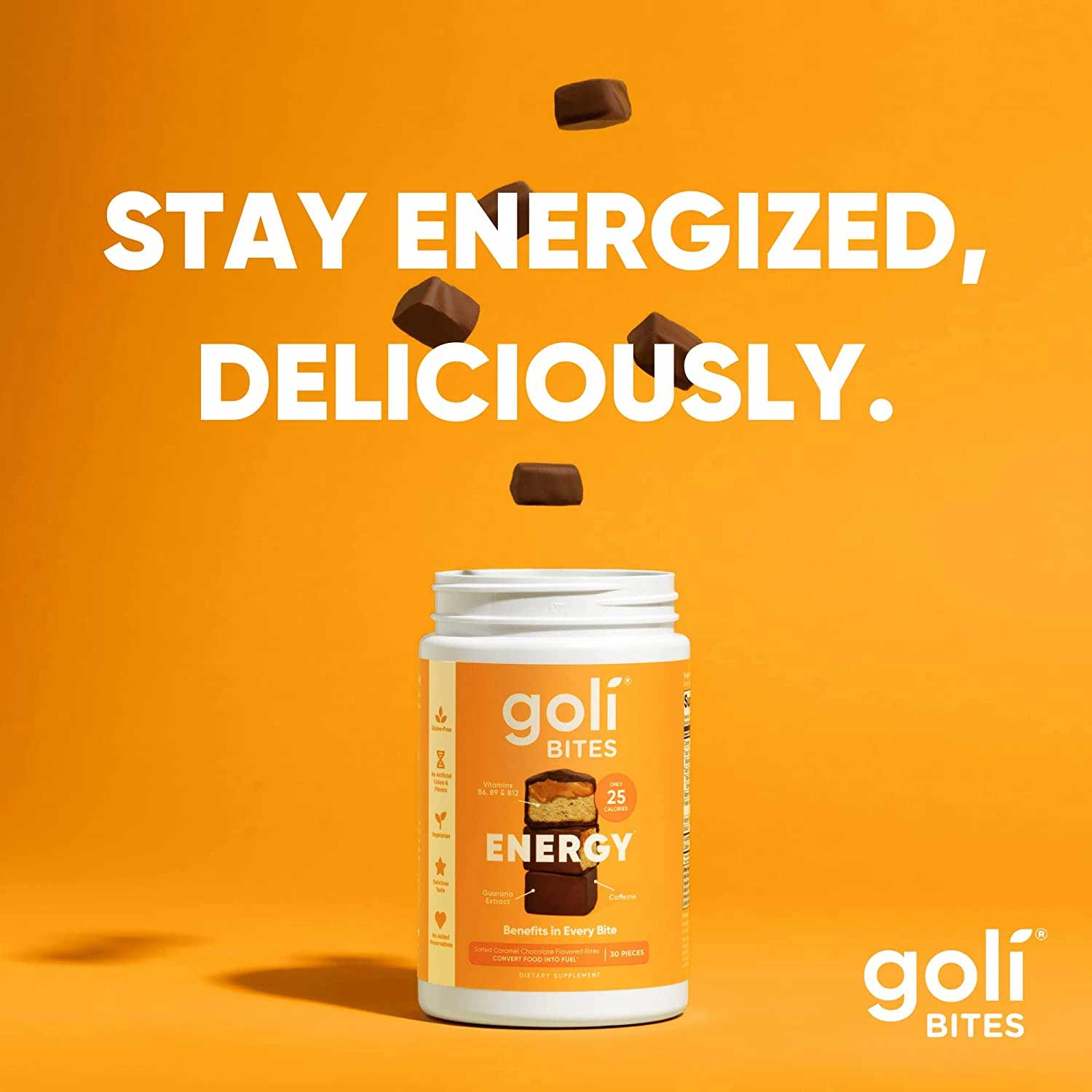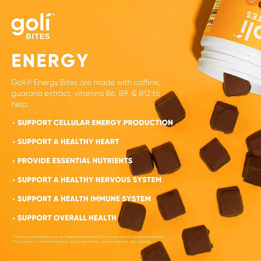 مکمل شکلاتی انرژی دهنده گلی Goli Bites Energy محصولی نوآورانه و حاوی عصاره های طبیعی با فرم شکلاتی جهت تولید انرژی سلولی و سلامت کلی بدن می باشد. مکمل انرژی دهنده گلی حاوی عصاره میوه گوارانا از جنگل های آمازون با خواص انرژی دهندگی، کافئین، ویتامین های B6 ،B9 و B12 است که به پشتیبانی از بسیاری از عملکردها در سراسر بدن کمک می کند. مکمل شکلاتی گلی دارای شکلات فراوری شده هلندی با کمترین کالری و طعم خوشمزه است، این ترکیب بدون مواد نگهدارنده، رنگ مصنوعی، طعم دهنده و گلوتن می باشد.