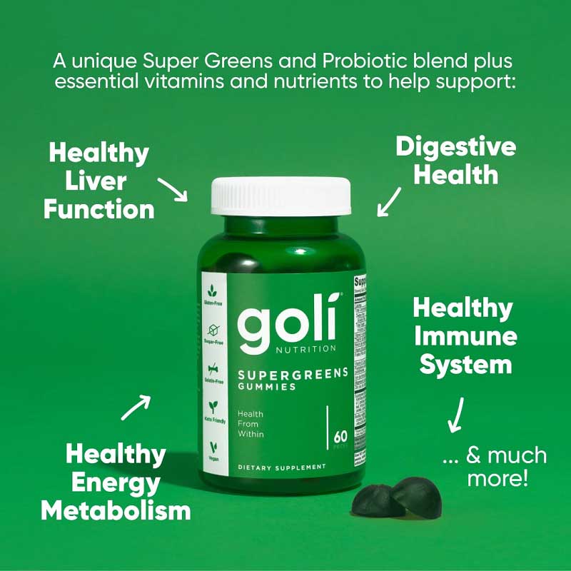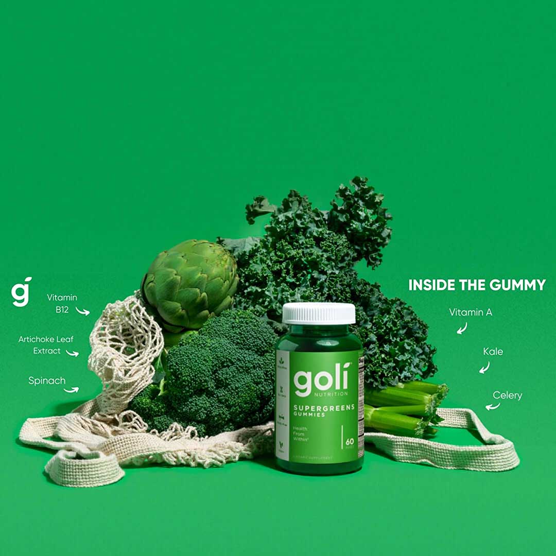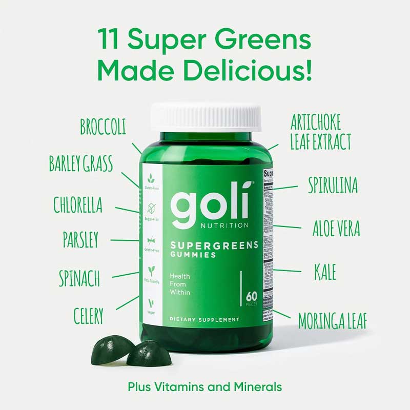مکمل پاستیل گیاهان سوپر گرین گلی نوتریشن Goli Supergreens محصولی ارگانیک و باکیفیت بدست آمده از سبزیجات سرشار از ویتامین و مواد معدنی مورد نیاز بدن است و دارای عملکرد بهبود گوارش، حمایت از سلامت قلب، حمایت آنتی اکسیدانی، بهبود عملکرد کبد، تقویت سیستم ایمنی و بهبود متابولیسم سوخت و ساز بدن می باشد. مکمل سوپر گرین گلی حاوی عصاره 11 گیاه شامل کلم پیچ، کلم بروکلی، برگ کنگر فرنگی، جلبک دریایی اسپیرولینا، آلوئه ورا، برگ مورینگا، جعفری، اسفناج، کرفس، جلبک دریایی کلرلا و برگ جو است که با ویتامین ها و مواد معدنی تکمیل شده است. این فرمول همچنین بدون ژلاتین است و برای تولید فرمول کاملا گیاهی وگن، به جای ژلاتین از فیبر گیاهی پکتین بدست آمده از قسمت سفید داخلی پوست پرتقال استفاده کرده است.
