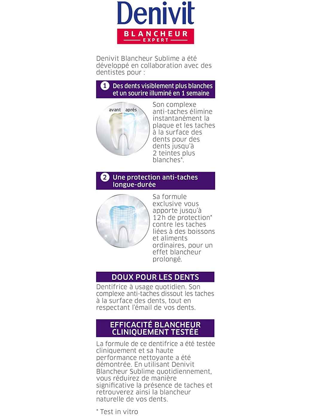 خمیردندان سفیدکننده دنیویت سابلیم Denivit Sublime دارای فرمول توسعه یافته توسط متخصصین دندانپزشک با عملکرد سریع درخشان کنندگی است که نتیجه آن دندان هایی 2 درجه سفیدتر می باشد. خمیردندان سابلیم دنیویت همچنین محافظت کننده 12 ساعته مینای دندان در برابر جرم بوده و به کمک فرمول مناسب برای استفاده روزانه، سفیدی طبیعی دندان ها را احیا می کند. علاوه بر این وجود فلوراید با سطح 1450ppm جهت محافظت در برابر پوسیدگی دندان، محصول کاملی را حاصل شده است.