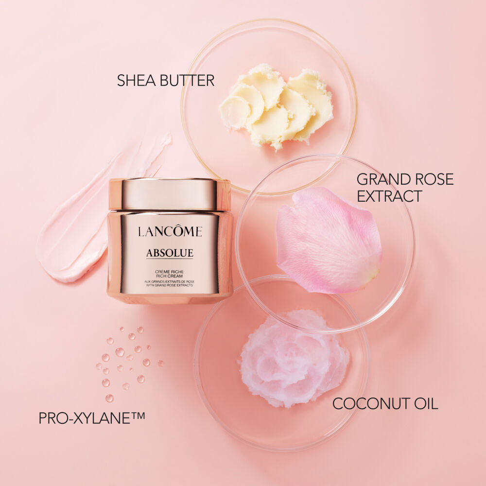 کرم ضدچروک و روشن کننده لانکوم ابسولو Lancome Absolue Rich محصولی باکیفیت با عملکرد چندگانه جهت کاهش فوری خطوط و چروک، جوانسازی پوست، افزایش سفتی، افزایش روشنایی و آبرسانی 24 ساعته پوست می باشد. کرم ابسولو ریچ لانکوم حاوی ترکیب انحصاری از عصاره گل گرند رز، روغن گل رز و کنستانتره گل رز است و احیاکننده و بازسازی کننده پوست همراه با آبرسانی، افزایش سفتی و فربگی پوست می باشد. کرم ریچ لانکوم همچنین دارای بافت ویژه ابریشمی و غلیظ است که هنگام استفاده بر روی صورت آب شده و مانند لوسیون و سرم به سرعت جذب پوست می شود، پس از جذب در لایه های پوست دوباره به فرم غنی تبدیل می شود و احساس پوستی فربه، شاداب و پرحجم را به ارمغان می آورد.