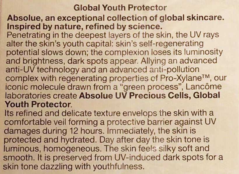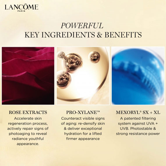 کرم ضدآفتاب و ضدپیری لانکوم ابسولو یو وی Lancome Absolue UV محصولی باکیفیت با عملکرد چندگانه مراقبت کننده از جوانی پوست و محافظت در برابر پرتوهای UVA و UVB آفتاب می باشد. ضدآفتاب لانکوم دارای فناوری اختراعی Mexoryl جهت محافظت قدرتمند و ماندگار است که با تشکیل سپر محافظتی نامرئی و قدرتمند 12 ساعته از آسیب های ناشی از آفتاب جلوگیری می کند و با گذشت زمان پایداری آن حفظ می شود. ضدآفتاب ابسولو لانکوم همچنین حاوی ترکیب انحصاری از عصاره گل گرند رز، روغن گل رز و کنستانتره گل رز است و احیاکننده و بازسازی کننده پوست همراه با آبرسانی، افزایش سفتی و فربگی پوست می باشد.
