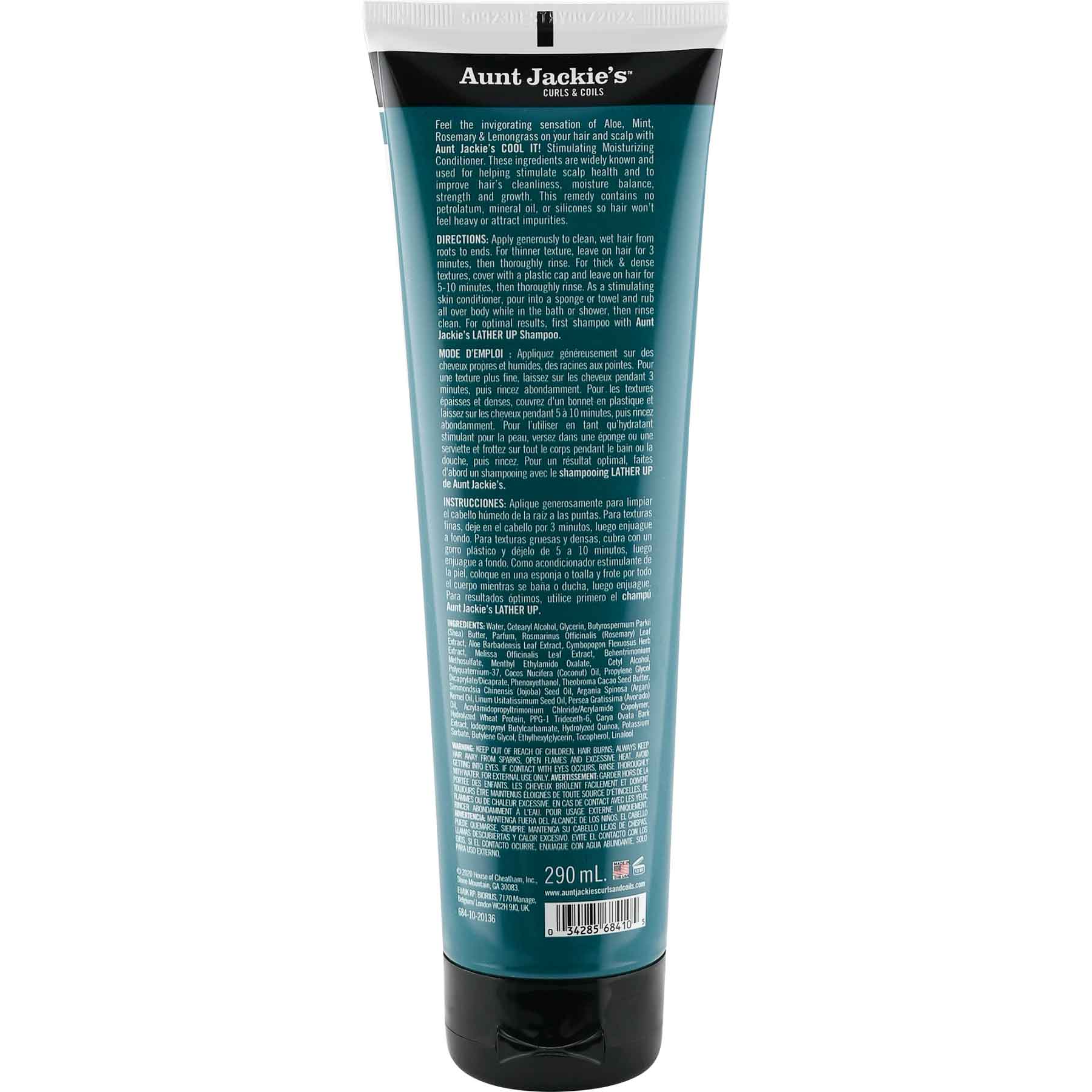 نرم کننده موهای فر آنت جکی Aunt Jackies Cool It دارای فرمول باکیفیت و حاوی عصاره های طبیعی جهت آبرسانی و پرکنندگی مجدد رطوبت، نرم کننده بسیار خوب و احیای درخشندگی موها می باشد. نرم کننده موی آبرسان کول ایت آنت جکی حاوی عصاره آلوئه ورا جهت رطوبت رسانی موها و نعناع با خواص خنک کنندگی جهت احیای شادابی و سرزندگی موها می باشد، این فرمول برای سلامتی پوست سر، تقویت و احیا و رشد موها مناسب است و حس حضور در یک جلسه اسپا را به ارمغان می آورد. عصاره های طبیعی دیگر نرم کننده موی آنت جکی شامل علف لیمو و عصاره رزماری جهت تغذیه و متعادل سازی رطوبت در تارهای مو است، این ترکیب علاوه بر این فاقد مواد شیمیایی مضر از جمله سیلیکون، پترولیوم و روغن های معدنی است و از ایجاد سنگینی و جذب آلودگی روی موها جلوگیری می کند.