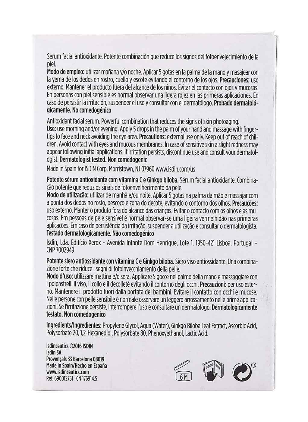سرم جوان کننده و روشن کننده ویتامین سی ایزدین Isdin Flavo-C حاوی ترکیب قدرتمند جهت محافظت پیشرفته در برابر آسیب و رادیکال های آزاد ناشی از پرتوهای آفتاب UVA و UVB به همراه روشن کنندگی و ایجاد نمای جوان و منعطف پوست می باشد. سرم سی فلاو ایزدین حاوی ویتامین C خالص با خواص روشن کنندگی، شاداب کنندگی و کاهش خطوط چروک است که با عصاره برگ گینکو بیلوبا (درخت کهن دار) به عنوان آنتی اکسیدان قوی محافظت کننده پوست در برابر آسیب دیدگی و رادیکال های آزاد همراه شده است. این فرمول همراه با روشن کنندگی و کاهش تیرگی ها و لک پوست، باعث افزایش سفتی و صافی پوست های شل و دهیدراته شده و نمای جوان پوست را احیا می کند.