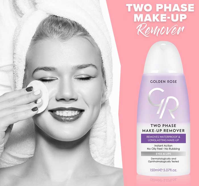 محلول دوفاز پاک کننده آرایش چشم و لب گلدن رز Golden Rose Two Phase دارای فرمول پاک کننده فوری انواع آرایش چشم و لب از جمله آرایش ضدآب و ماندگار و بدون برجای گذاشتن احساس چربی می باشد. محلول دوفاز گلدن رز حاوی مواد موثر فعال جهت محافظت از مژه ها بوده و همچنین بدون پارابن، رایحه و گلوتن است.