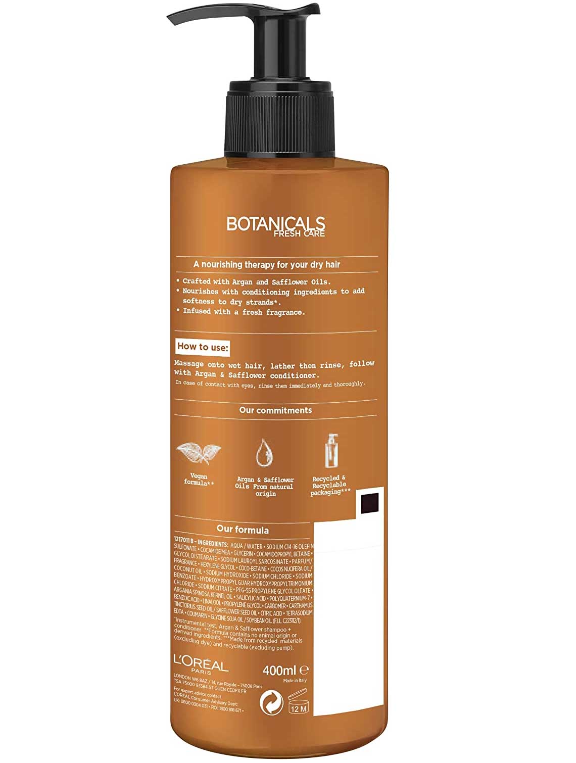 شامپو مغذی روغن آرگان و گلرنگ لورال LOreal Argan Safflower دارای فرمول باکیفیت گیاهی و حاوی عصاره های طبیعی از لاین محصولات بوتانیک لورال جهت تغذیه موهای خشک، رفع خشکی و احیای نرمی و سلامتی موها می باشد. شامپو مغذی بوتانیک فرش لورال حاوی روغن آرگان و روغن گلرنگ غنی از لیپیدهای تغذیه کننده و رطوبت رسان فیبر مو است، این فرمول با روغن نارگیل و روغن سویا جهت لطافت بخشی و تغذیه موها همراه شده است و حس موهایی خوشبو، تغذیه شده و لطیف را به ارمغان می آورد.