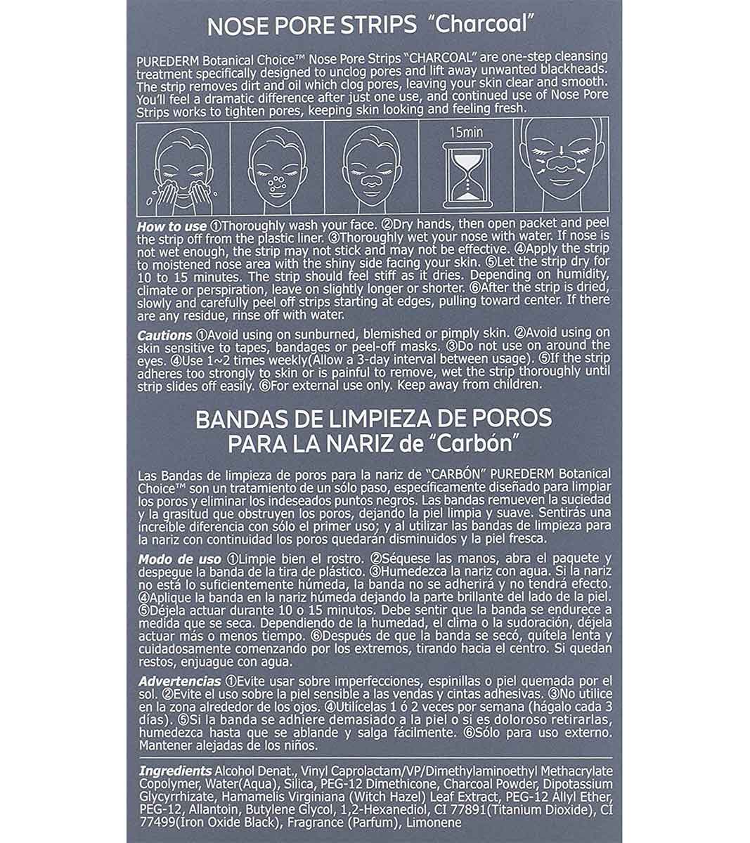 چسب پاک کننده بینی پیوردرم حاوی ذغال Purederm Nose Pore Strip دارای فرمول حاوی ذغال شارکل با قابلیت جذب آلودگی ها و چربی اضافی منافذ پوست به همراه عصاره فندق افسونگر (هاماملیس) برای تسکین بخشی پوست می باشد. چسب بینی پیور درم پاک کننده منافذ پوست اطراف بینی و از بین برنده جوش های سر سیاه می باشد. چسب نواری پاک کننده بینی پیور درم برای افرادی که منافذ باز اطراف بینی دارند یا پوست چرب و جوش های سرسیاه دارند مناسب است. روش استفاده آن بدین صورت است که هفته ای یک یا دو بار ابتدا صورت و اطراف بینی رو شستشو داده و چسب نواری را روی بینی قرار می دهیم و پس از 10 تا 15 دقیقه آن را درآورده و آبکشی می نماییم.