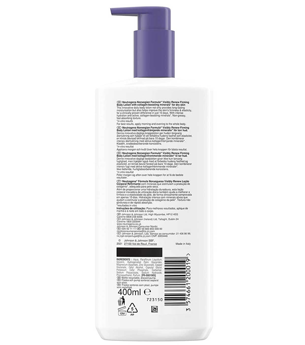 لوسیون بدن سفت کننده نوتروژنا Neutrogena Visibly Renew دارای فرمول باکیفیت نروژی توسعه یافته توسط متخصصین پوست جهت افزایش سفتی و انعطاف پذیری پوست به همراه آبرسانی طولانی مدت می باشد. لوسیون بدن نوتروژنا همچنین دارای فرمول تایید شده کلینیکال با عملکرد افزایش قابل ملاحظه سفتی پوست در طی 10 روز است، این ترکیب حاوی مواد معدنی تسریع کننده تولید کلاژن برای افزایش صافی پوست است و علاوه بر این با جذب شوندگی سریع و بدون احساس چربی، پوستی هموار، انعطاف پذیر و سفت تر با رطوبت رسانی پیوسته را به ارمغان می آورد.