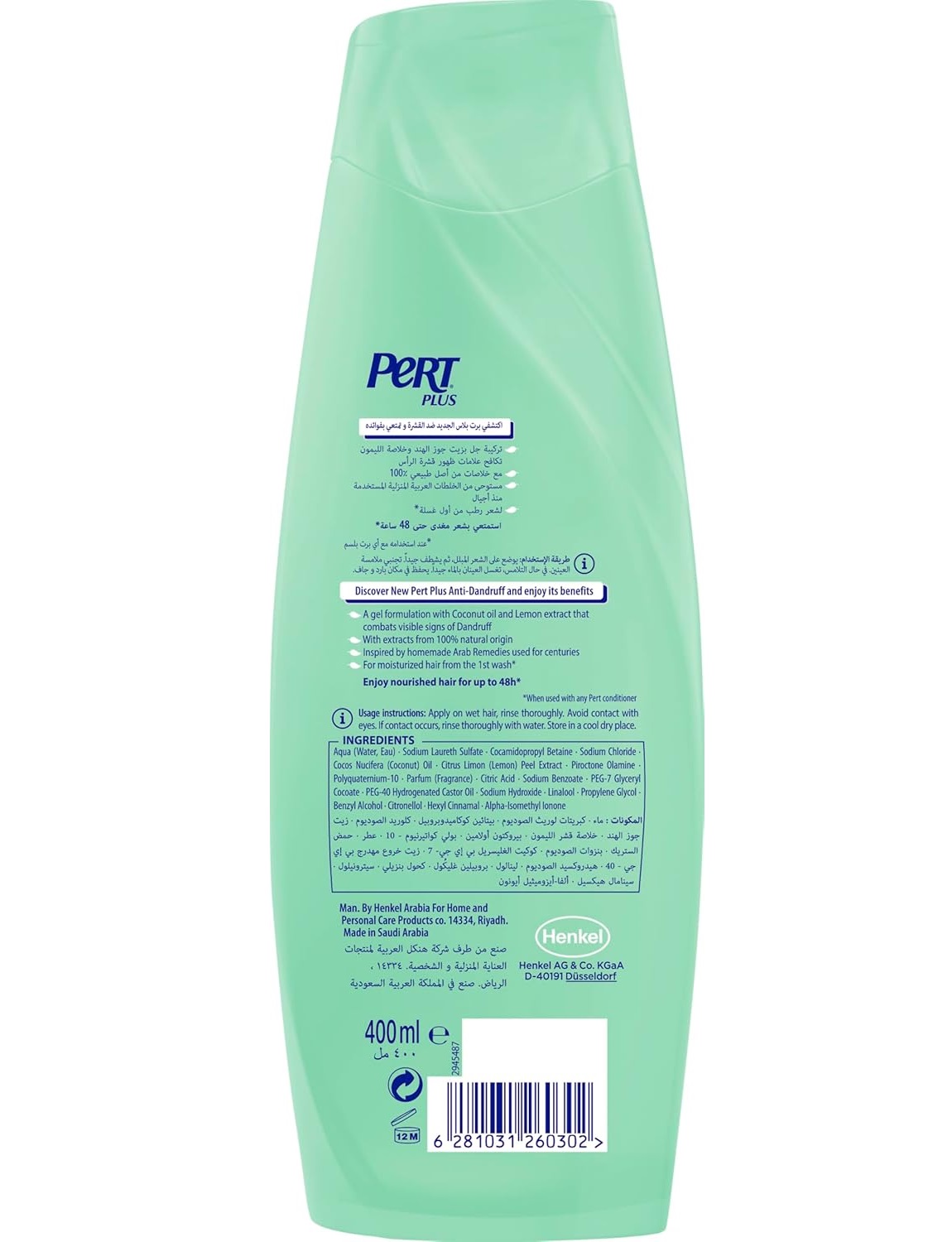 شامپو نارگیل و لیموی پرت پلاس Pert Coconut and Lemon حاوی عصاره های طبیعی و دارای فرمول ضدشوره و مغذی می باشد. شامپو ضدشوره پرت حاوی لیمو جهت پاک کنندگی و احیاکنندگی پوست سر و نارگیل جهت تغذیه مو و جلوگیری از خشکی موها می باشد.