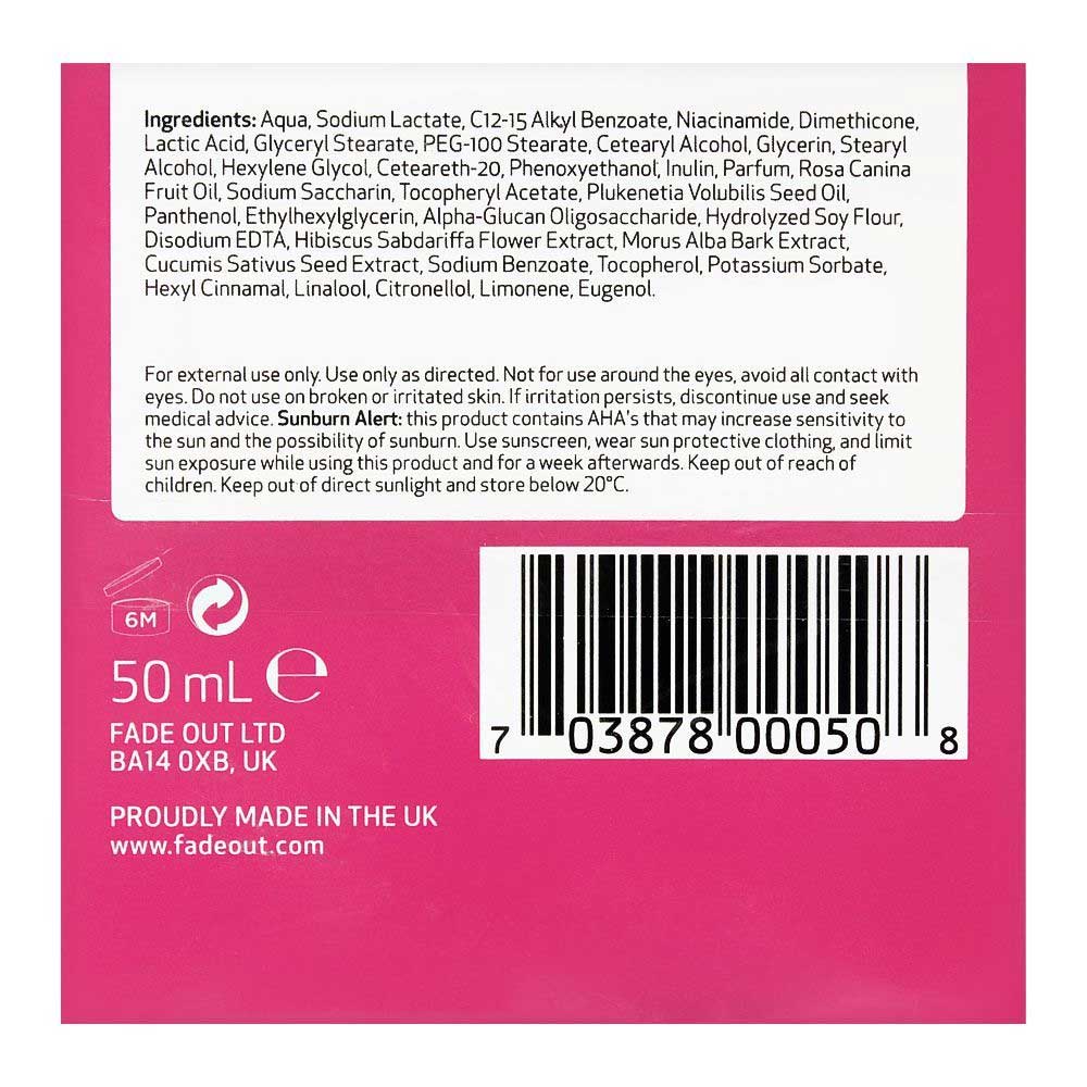 کرم روشن کننده و کلاژن ساز شب فید اوت Fadeout Collagen Boost Night حاوی عصاره های طبیعی جهت روشن کنندگی نقاط تیره و لک و افزایش انعطاف پذیری و صافی پوست توسط تسریع بخشی تولید کلاژن در زمان استراحت در طی سیکل نوسازی سلولی شب می باشد. کرم روشن کننده فیداوت حاوی لاکتیک اسید 2.8 درصد جهت لایه برداری ملایم و پاک کردن پوست کدر و مرده است. مواد موثر دیگر کرم شب فیداوت شامل موارد زیر است: