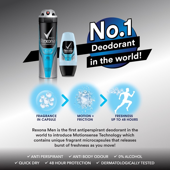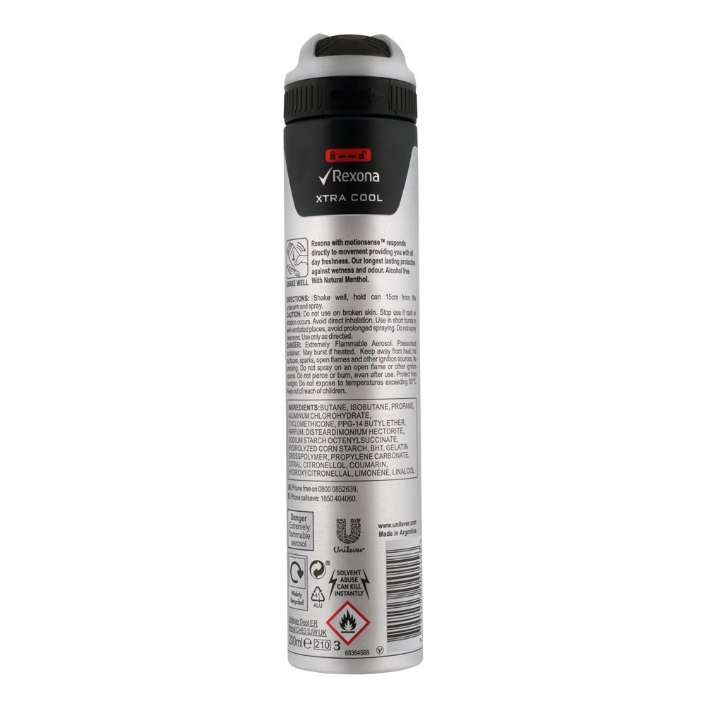 اسپری ضد تعریق آقایان رکسونا اکسترا کول Rexona Xtra Cool محافظت کننده 48 ساعته خشکی و تازگی زیر بغل به همراه خنک کنندگی قوی و رایحه تازه نعناع و لاوندر می باشد. اسپری ضدتعریق رکسونا دارای تکنولوژی موشن سنس جهت محافظت کامل از خشکی زیربغل در حرکت و شرایط پرتحرک است که با تکنولوژی رایحه کپسوله شده برای آزاد سازی تدریجی رایحه در طول روز و خنثی سازی بوی عرق همراه شده است.