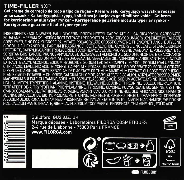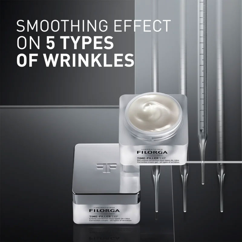 ژل کرم ضدچروک پوست مختلط و چرب فیلورگا تایم فیلر Filorga Time Filler 5XP دارای فرمول ویژه برای رفع تمامی انواع چروک شامل چروک های سطح پوست، چروک های ناشی از خشکی، چروک های عمیق، چروک های ناشی از انقباض میمیک صورت و چروک های گردن است. ژل کرم تایم فیلر 5 روش پزشکی زیبایی را برای تصحیح چروک های پنج گانه صورت و گردن بکار گرفته است، این فرمول حاوی کمپلکس تری پپتیدهای قوی صاف کننده پوست، هیالورونیک اسید برای آبرسانی، رازیانه دریایی غنی از مواد معدنی و کمپلکس مواد فعال بازسازی کننده پوست است و چروک دینامیک را کاهش داده و پوست صورت و گردن را ریلکس می کند.