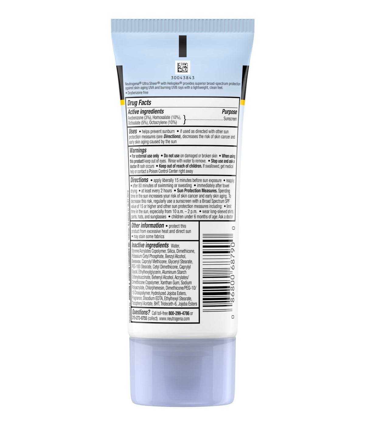 لوسیون ضدآفتاب نوتروژنا اولترا شیر Neutrogena Ultra Sheer Dry-Touch SPF55 دارای فرمول باکیفیت جهت محافظت در برابر پرتوی آفتاب و جلوگیری از ایجاد نشانه های زودرس پیری پوست ناشی از پرتوی مضر آفتاب می باشد. لوسیون ضدآفتاب نوتروژنا دارای فناوری هلیوپلکس Helioplex جهت محافظت پایدار در برابر پرتوی UVA (نفوذکننده به لایه های عمقی پوست) و UVB (ایجاد کننده آفتاب سوختگی) است، این محافظت پیوسته و یکنواخت باعث می شود مواد موثر ضدآفتاب در طول زمان در اثر برخورد پرتوهای آفتاب دچار از هم گسیختگی و افت کیفیت نشوند و محافظت کامل و پایدار حاصل شود. علاوه بر این وجود فناوری Dry-Touch باعث ایجاد بافت بسیار سبک و غیرچرب کننده و با نمای نهایی مات و احساس راحتی کامل پوست می شود.