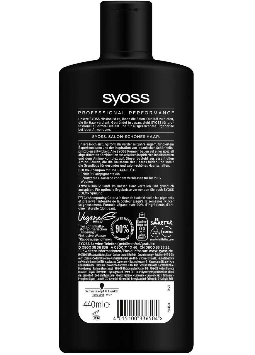 شامپو موهای رنگ شده سایوس Syoss Color حاوی بیش از 90 درصد عصاره های طبیعی و فرمول ویژه محافظت کننده موهای رنگ شده و هایلایت شده می باشد. شامپو موهای رنگ شده با الهام از سنت های زیبایی آسیایی حاوی عصاره شکوفه های گل کاملیای ژاپنی برای حفظ کیفیت رنگ مو و درخشندگی می باشد. این فرمول همچنین حاوی کمپلکس آمینو اسید به عنوان اجزای سازنده مو برای استحکام بخشی و احیای نمای سالم موها است، در نتیجه موهایی درخشنده و زیبا خواهیم داشت.