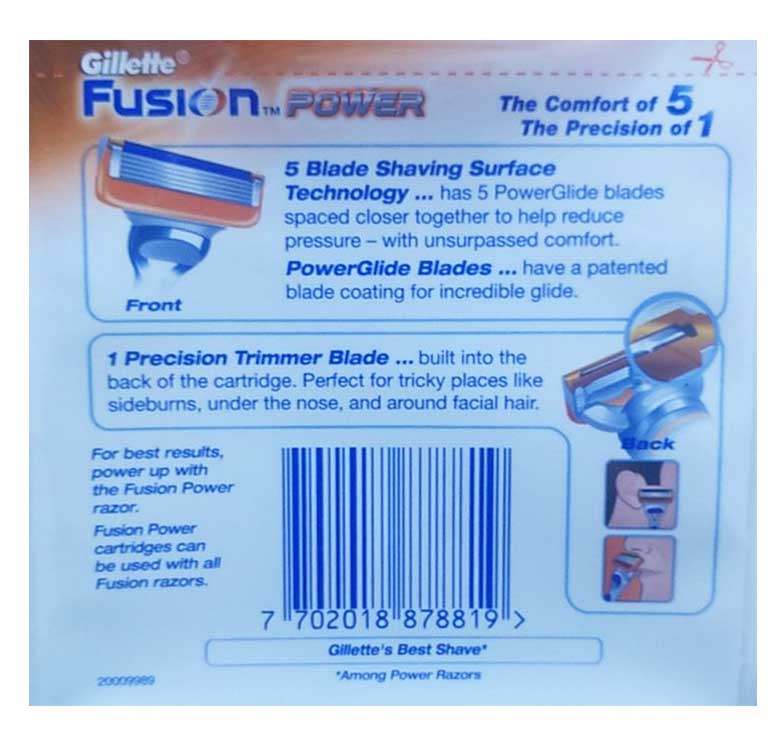تیغ اصلاح یدک ژیلت فیوژن پاور Gillette Fusion Power دارای تکنولوژی اصلاح 5 تیغه به کمک نوار ژل مرطوب کننده با آلوئه ورا می باشد. تیغ اصلاح یدک ژیلت فیوژن پاور همچنین دارای یک تیغه اصلاح دقیق در پشت کارتریج برای نقاط حساس صورت و خط گرفتن می باشد.