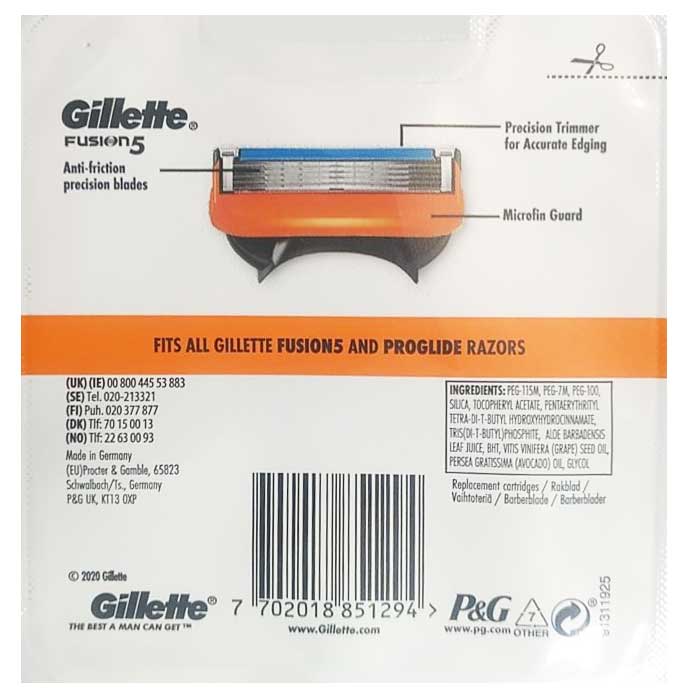 تیغ اصلاح یدک ژیلت فیوژن Gillette Fusion5 دارای تکنولوژی اصلاح 5 تیغه به کمک نوار ژل مرطوب کننده با آلوئه ورا می باشد. تیغ اصلاح یدک ژیلت فیوژن همچنین دارای یک تیغه اصلاح دقیق در پشت کارتریج برای نقاط حساس صورت و خط گرفتن می باشد.
