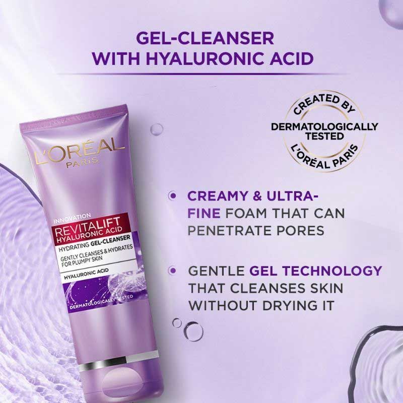 ژل شوینده و آبرسان هیالورونیک اسید لورال رویتالیفت LOreal Revitalift دارای فناوری ژل تبدیل شونده به فوم با بافت کرمی و بسیار ریز برای نفوذ در منافذ پوست و پاک کنندگی ملایم آلودگی ها و آرایش پوست است. ژل شوینده رویتالیفت حاوی هیالورونیک اسید با قابلیت جذب رطوبت 1000 برابر وزن ملکولی آن است، این فرمول پرکننده مجدد رطوبت پوست می باشد و پوستی فربه تر، تمیز و شاداب را به ارمغان می آورد.