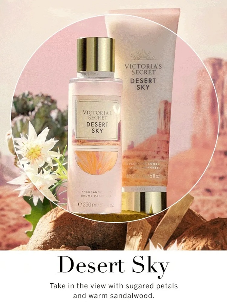 بادی اسپلش ویکتوریا سکرت Desert Sky محصولی با کیفیت از خانه مد ویکتوریا سکرت بوده و دارای رایحه گلی و چوبی است. این بادی اسپلش دارای نت های گلبرگ های شکری شده و چوب صندل گرم است. در فرمولاسیون بادی میست ویکتوریا سکرت از آلوئه ورا و بابونه استفاده شده که خاصیت تسکین دهندگی پوست را دارد و باعث شادابی و طراوت پوست میگردد.