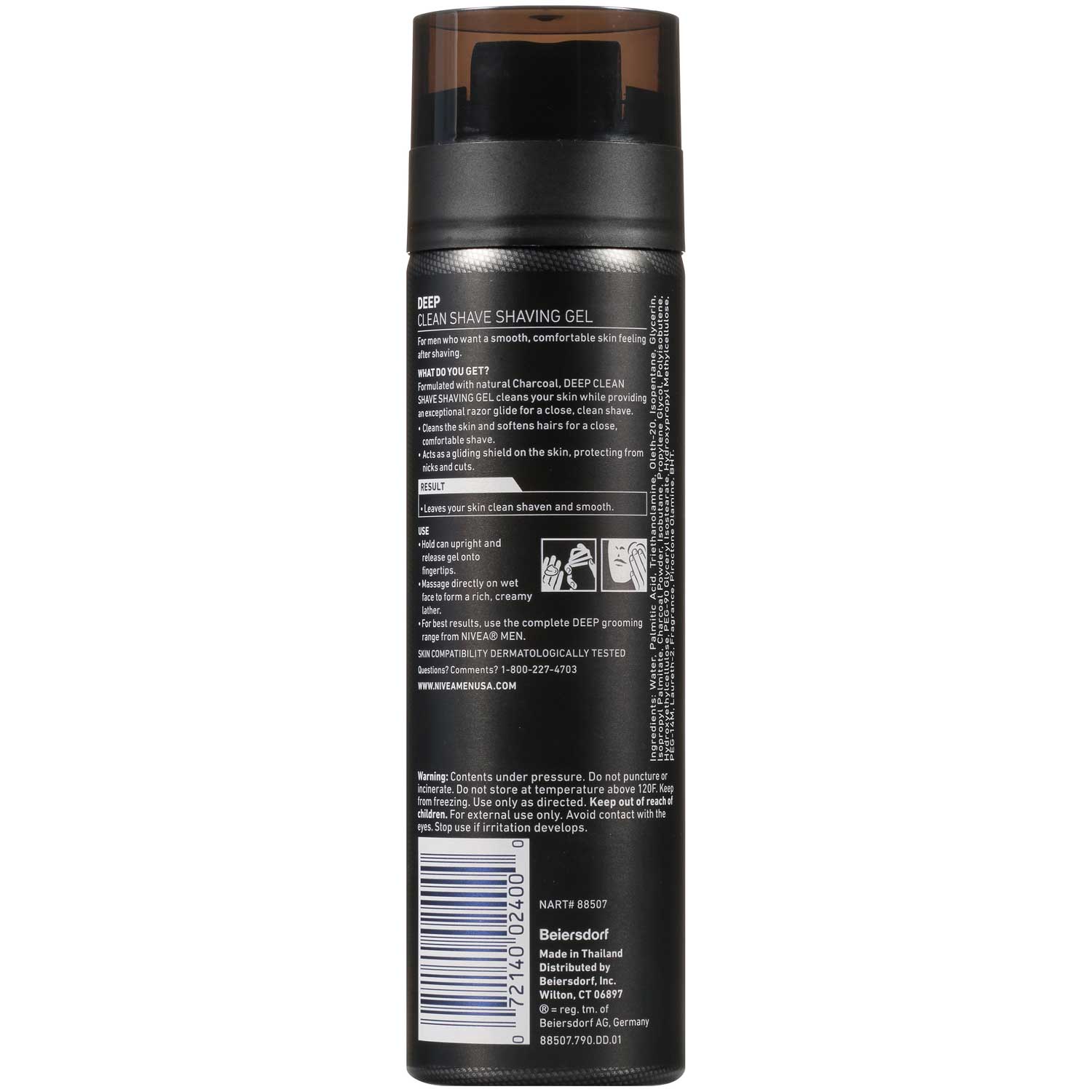 ژل اصلاح نیوا دیپ Nivea Deep دارای فرمول غنی شده با ذغال فعال شارکل برای پاکسازی منافذ و پاک کنندگی چربی اضافی پوست به همراه محافظت ویژه در برابر تیغ اصلاح می باشد. این فرمول دارای بافت ژل تبدیل شونده به فوم کرمی غنی است و پوستی تمیز و هموار را پس از شیو کردن به ارمغان می آورد.