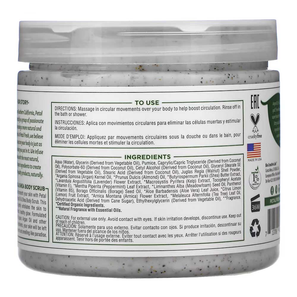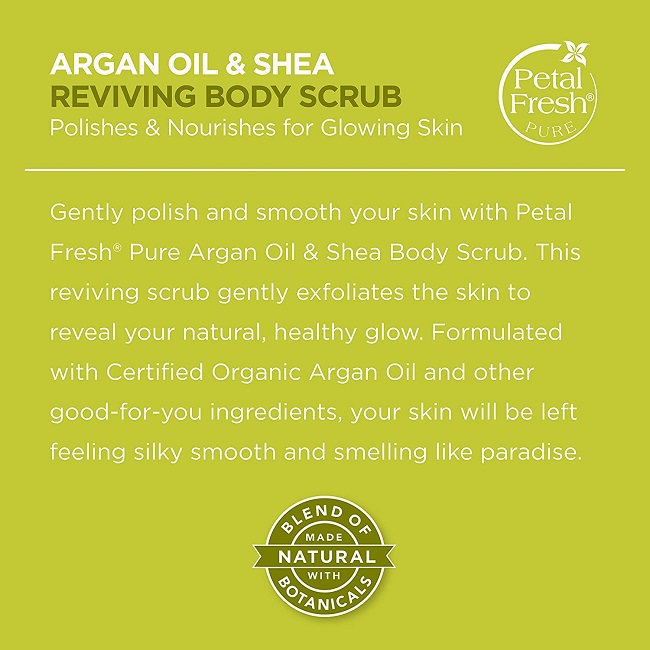 اسکراب بدن روغن آرگان و شی باتر پتال فرش Petal Fresh Reviving محصولی باکیفیت و حاوی عصاره های طبیعی ارگانیک جهت سایش ملایم پوست به همراه روغن های مغذی و ویتامین های ضروری برای احیای درخشندگی طبیعی پوست سالم، هموار و نوسازی شده می باشد. اسکراب پتال فرش حاوی روغن ارگانیک آرگان و شی باتر برای تغذیه و ملایمت بر روی پوست و احساس پوستی مخملی است. اسکراب پتال فرش فاقد سولفات، پارابن، رنگ و دیگر مواد شیمیایی مضر است و محصولی کامل را پدید آورده است. سایر عصاره های کلیدی طبیعی اسکراب بدن پتال فرش شامل موارد زیر می باشد: