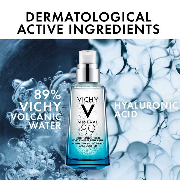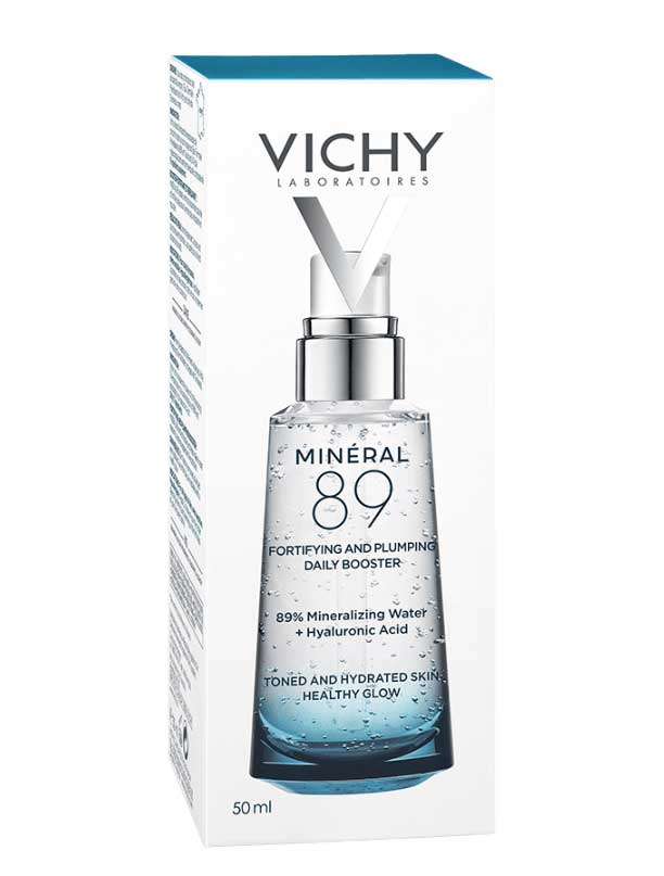 سرم آبرسان ویشی مینرال Vichy Mineral 89 دارای فرمول باکیفیت و قدرتمند برای آبرسانی پوست، استحکام بخشی و فربه سازی صورت به همراه محافظت کنندگی در برابر عوامل ناملایم از جمله تغییرات آب و هوایی، استرس، خستگی و آلودگی هوا می باشد. سرم آبرسان ویشی حاوی 89 درصد آب آتشفشانی بدست آمده از منطقه ویشی فرانسه متشکل از 15 ماده معدنی مینرال مورد نیاز پوست برای افزایش استحکام و محافظت روزانه پوست است. این ترکیب همچنین حاوی هیالورونیک اسید خالص برای آبرسانی قوی، حفظ شادابی و افزایش فربگی و انعطاف پذیری پوست می باشد. نتایج آزمایشگاهی بر روی 3200 فرد استفاده کننده از سرم مینرال ویشی اینگونه بدست آمده است: