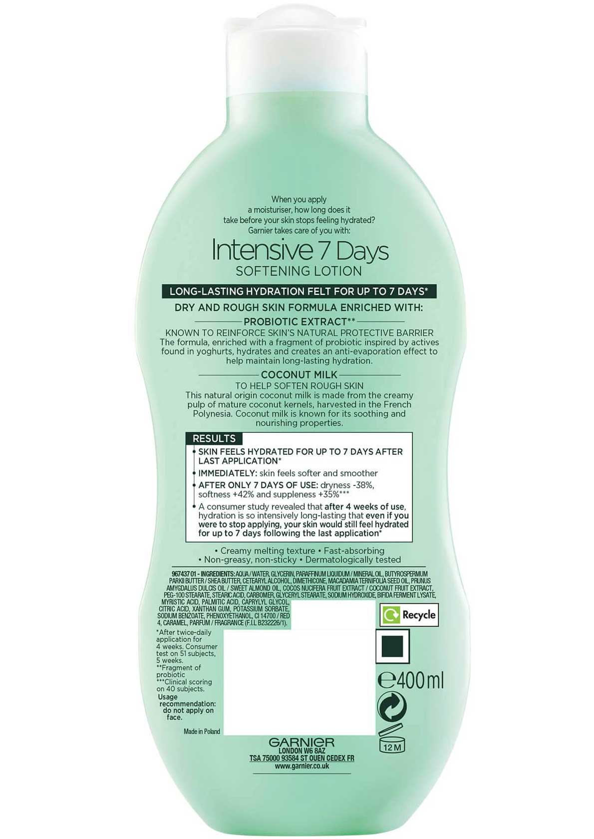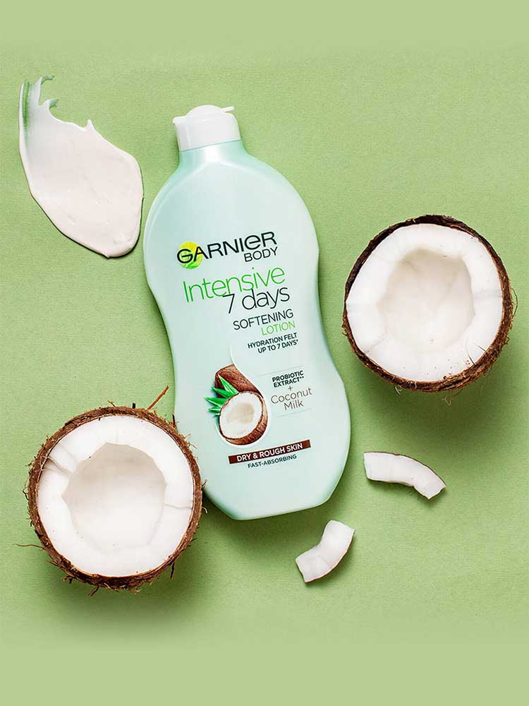 لوسیون بدن لطافت بخش شیر نارگیل گارنیه Garnier Softening Coconut Milk غنی شده با شیر نارگیل بدست آمده از نارگیل رسیده در جزیره پلی نزیای فرانسه با خواص آبرسانی، تسکین بخشی و تغذیه کنندگی بوده و آبرسانی طولانی مدت تا 7 روز پس از استفاده را به همراه دارد. لوسیون بدن لطافت بخش گارنیه همچنین حاوی عصاره های پروبیوتیک بدست آمده از ماست جهت ایجاد سد محافظتی و جلوگیری از دهیدراته شدن و از دست دادن رطوبت پوست است. لوسیون گارنیه با فرمول جذب شونده سریع و بدون احساس چربی، محصولی دوست داشتنی در برنامه مراقبت روزانه مان محسوب می شود.