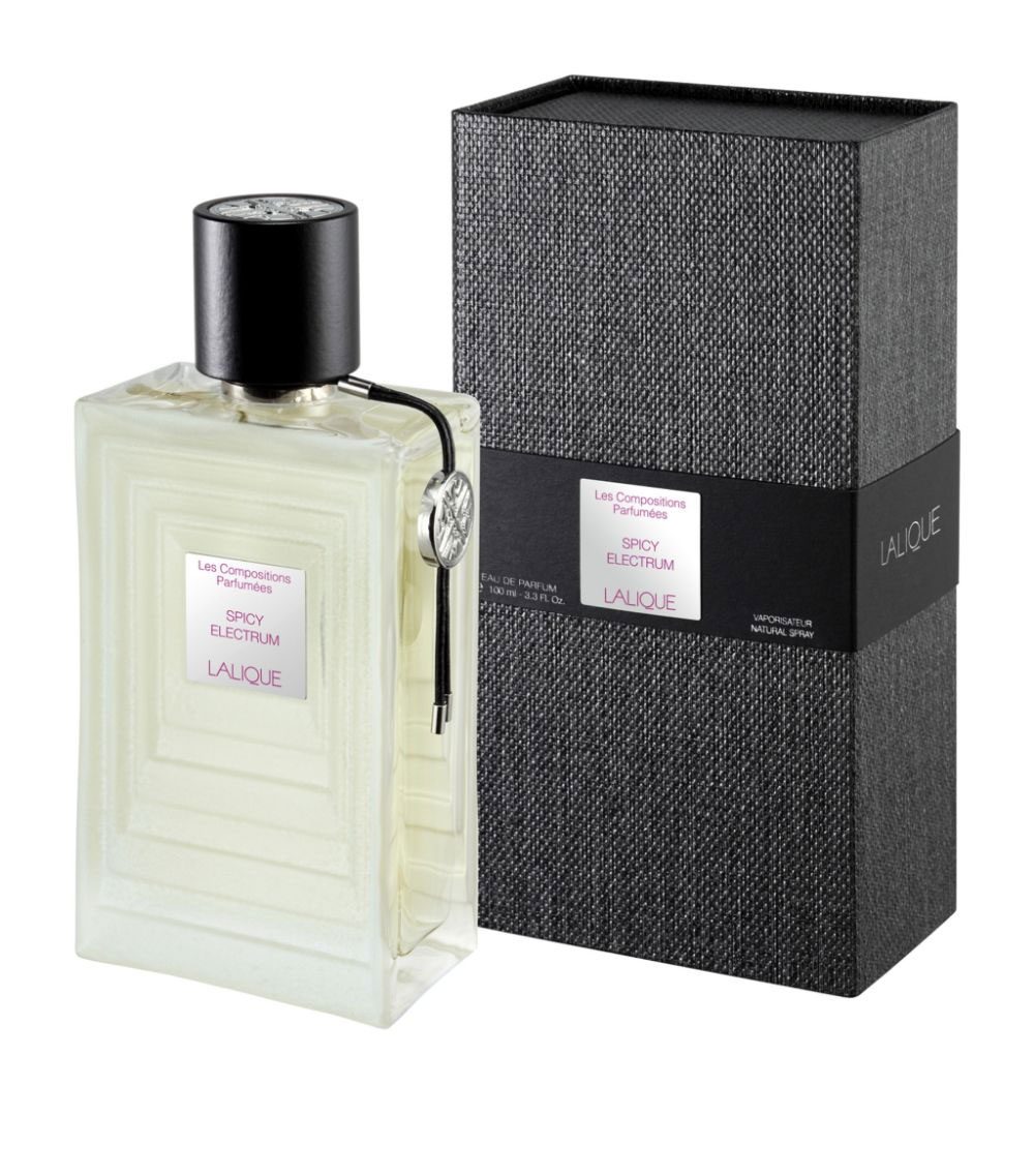عطر لالیک اسپایسی الکتروم Lalique Spicy Electrum معرفی شده در سال 2017 توسط خانه عطر لالیک و دارای رایحه کهربایی و چوبی می باشد. عطر لالیک اسپایسی الکتروم از مجموعه کالکشن Les Compositions Parfumees الهام گرفته از آلیاژهای گرانبهای صنعت جواهرسازی است و رایحه آغازین آن شامل فلفل صورتی، هل، صمغ لامی و زنجبیل است. در میانه مسیر بویایی رایحه یلانگ یلانگ قرار دارند. نت های پایانی این رایحه نیز شامل گل لابدانیوم، صمغ کندر، پاپیروس و گلسنگ می باشد.