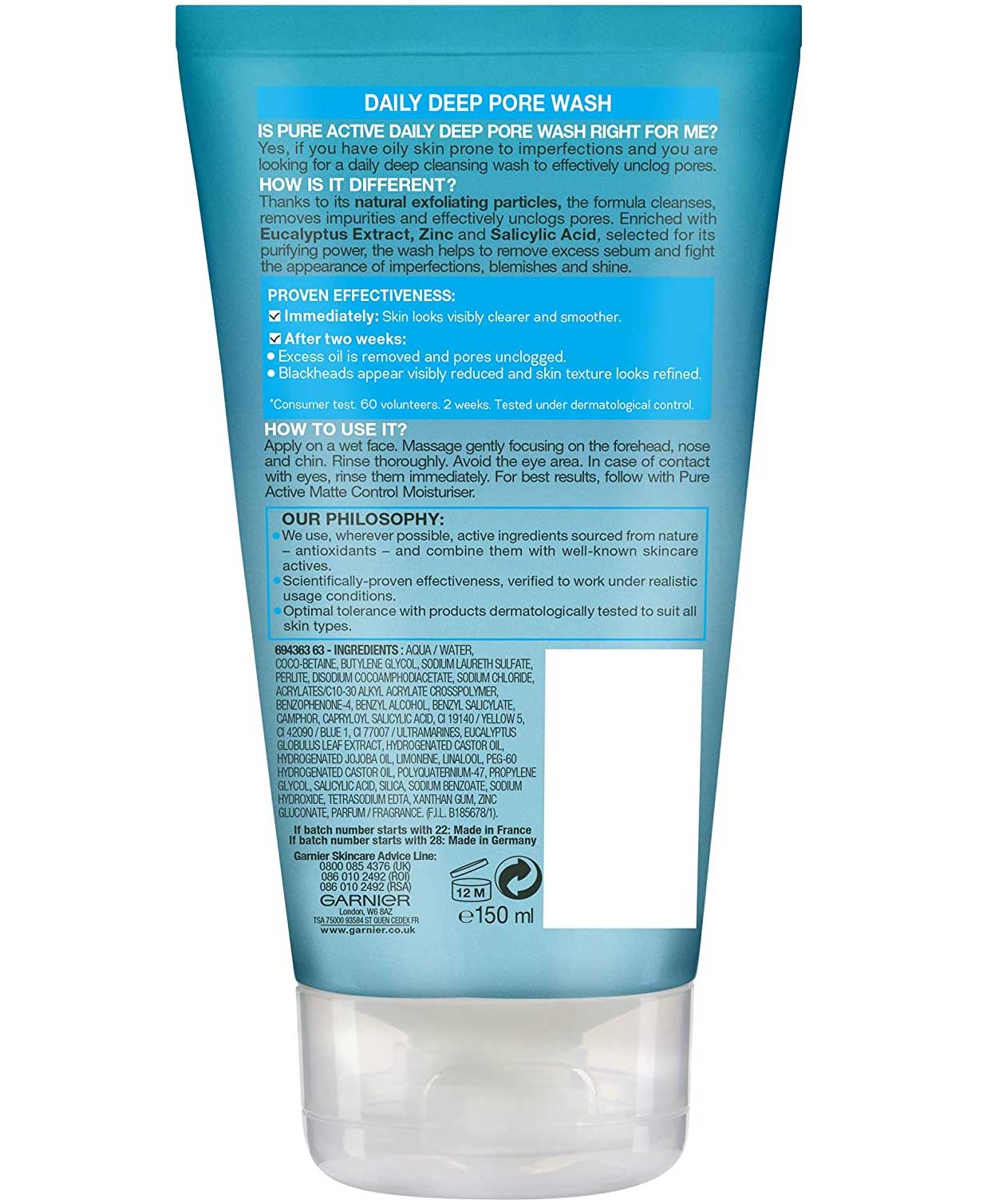 شوینده صورت پوست چرب گارنیه Garnier Pure Active غنی شده با عصاره اکالیپتوس جهت تصفیه و سم زدایی آلودگی های پوست، زینک و سالیسیلیک اسید به عنوان آنتی باکتریال جهت مقابله با جوش و جلوگیری از ایجاد جوش، ذرات سنگ آتشفشانی به عنوان دانه های اسکراب و عصاره جوجوبا برای لطافت بخشی و ملایمت بر روی پوست می باشد.
