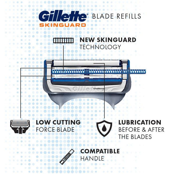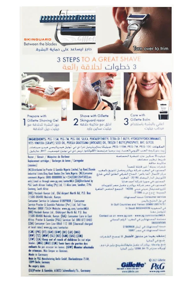 خودتراش ژیلت اسکین گارد به همراه تیغ یدک Gillette SkinGuard دارای فناوری جدید ژیلت با طراحی پیشرفته و دقیق برای پوست های حساس و جلوگیری از ایجاد خراش و حساسیت پوست می باشد. خودتراش ژیلت سری جدید دارای گارد محافظت کننده در میان دو تیغه اصلاح کننده از سطح پوست با حداقل نیرو می باشد، این گارد با صاف و یکدست کردن پوست در زیر تیغه ها و همچنین کنترل فشار وارد بر پوست باعث می شود از ایجاد خراش، حساسیت و سوزش پوست جلوگیری شود. به کمک این طراحی تیغه ها بر روی سطح هموار پوست حرکت می کنند و ضمن جلوگیری از ایجاد حساسیت، عملکرد قدرتمند را در اصلاح از سطح پوست دارا می باشند. خودتراش اسکین گارد همچنین دارای دو نوار ژل اصلاح حاوی روغن آووکادو در بالا و پایین تیغه ها، دندانه های بلندکننده موها قبل از تماس با تیغه ها و یک تیغه اصلاح دقیقه (خط زن) در پشت دسته ژیلت می باشد.