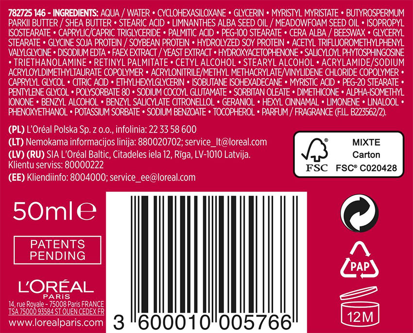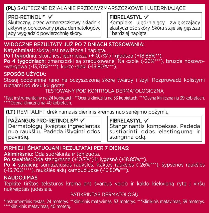 کرم آبرسان و ضدچروک روز لورال رویتالیفت LOreal Revitalift دارای فرمول جدید جهت آبرسانی، رفع چروک و افزایش استحکام و سفتی پوست می باشد. کرم لورال رویتالیفت حاوی پرو رتینول پیشرفته به عنوان ضد چروک قوی با قابلیت آزادسازی آهسته و تدریجی بوده که به صاف و هموار شدن سطح پوست کمک می کند. علاوه بر این ماده موثر دیگر موجود در کرم رویتالیفت لورال فایبرلاستیل است که این ماده یک کمپلکس فرم دهنده و لیفتینگ می باشد که باعث افزایش استحکام و انعطاف پذیری پوست می شود و نتیجه آن پوستی جوان تر و شاداب تر است.