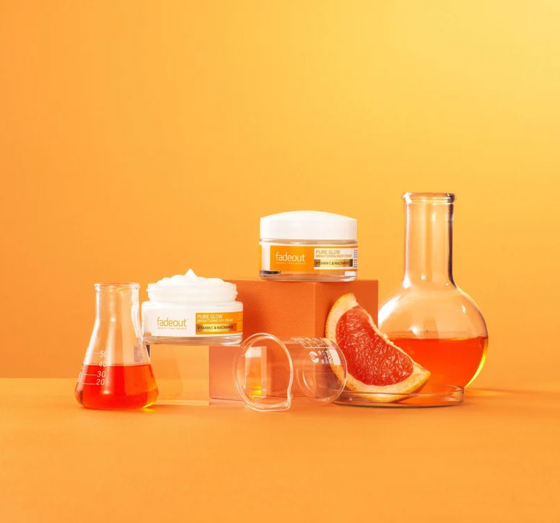 کرم روشن کننده روز ویتامین سی فید اوت Fadeout Pure Glow دارای فرمول ویژه با عملکرد دوگانه روشن کنندگی لک و تیرگی و تسکین التهاب و قرمزی پوست به همراه آبرسانی با آثار قابل مشاهده در طی 4 هفته می باشد. کرم روشن کننده پیور گلو فیداوت حاوی فرم پایدار ویتامین سی برای کاهش لک، تیرگی های ناشی از آفتاب و افزایش شفافیت پوست است، این ترکیب همچنین حاوی ویتامین E با خاصیت آنتی اکسیدانی و عمل کننده به صورت هم افزا با ویتامین سی برای محافظت از پوست در برابر پیری و استرس های محیطی است. مواد موثر کلیدی دیگر کرم پیور گلو شامل عصاره میوه پومیلو صورتی (از خانواده مرکبات) برای روشن کنندگی، افزایش شفافیت پوست های کدر و بدون درخشش و تنظیم تعادل رطوبت پوست است که با نیاسین آمید 2 درصد (ویتامین B3) برای کاهش تولید ملانین و پیگمنت های رنگی پوست و تسکین التهاب و گر گرفتگی همراه شده است، در نتیجه پوستی سفیدتر، شفاف تر و تسکین یافته خواهیم داشت.