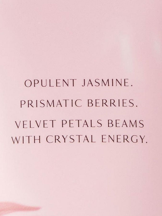 لوسیون بدن ویکتوریا سکرت ولوت پتالز کریستال Velvet Petals Crystal دارای فرمول باکیفیت متشکل از رایحه گلی و مشکی و نت های دلپذیر گل یاس مجلل، میوهای بری رنگارنگ و پرالین (بادام کاراملی) شکری همراه با رطوبت رسانی 24 ساعته پوست می باشد. لوسیون بدن ویکتوریا سکرت حاوی آلوئه ورا، ویتامین C، ویتامین E و آنتی اکسیدان بوده و استفاده از آن علاوه بر تغذیه و آبرسانی پوست حس بسیار خوشایندی به همراه دارد.