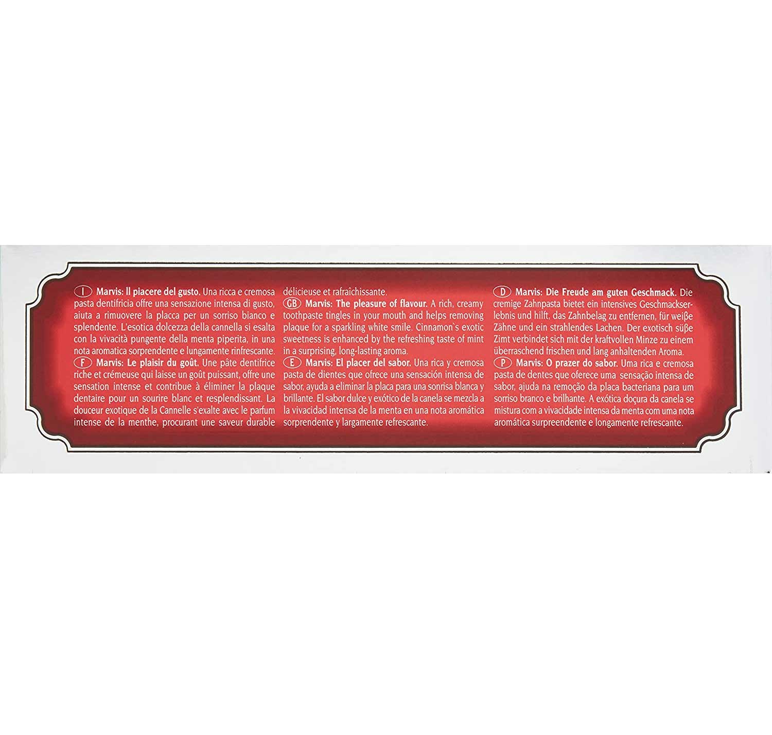 خمیردندان دارچین و نعناع مارویس Marvis Cinnamon Mint حاوی مواد موثر خالص و قوی برای محافظت از دندان ها در برابر پوسیدگی، رفع پلاک های باکتریایی، پاکسازی جرم های سرسخت و تازگی بخشی دهان می باشد. خمیردندان مارویس دارای طراحی لوکس و طعم شیرین و ادویه ای دارچین و خنک کننده نعنایی برای ماندگاری طولانی مدت احساس راحتی دهان و سبکی تنفس است. این خمیردندان همچنین حاوی فلوراید 0.2 درصد برای محافظت در برابر پوسیدگی و دارای بافت فشرده متفاوت همراه با طعم جذاب است و ترکیبی از احساسات سنتی، مترقی و جذاب را برای لذت بخش کردن برنامه روزانه محافظت از دندان فراهم می کند.