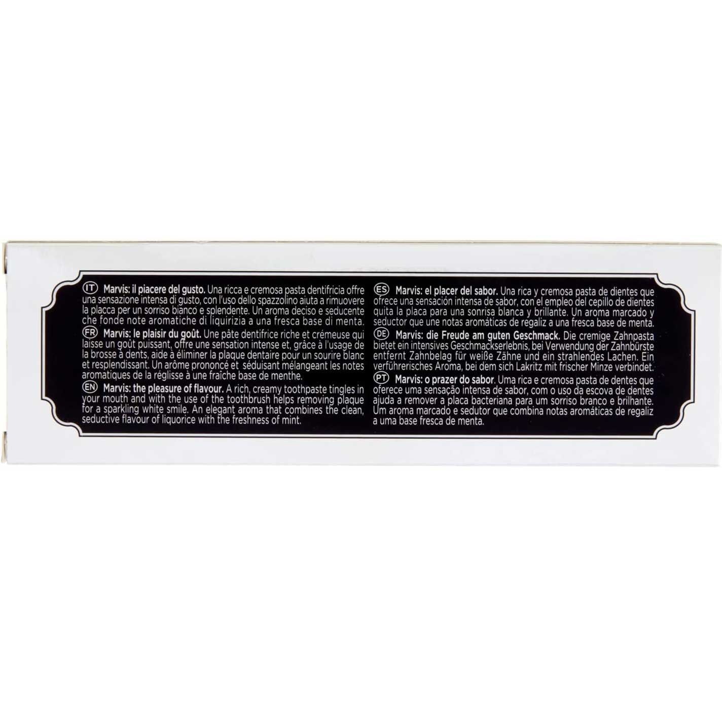 خمیردندان شیرین بیان مارویس Marvis Amarelli Licorice حاوی مواد موثر خالص و قوی برای محافظت از دندان ها در برابر پوسیدگی، رفع پلاک های باکتریایی، پاکسازی جرم های سرسخت و تازگی بخشی دهان می باشد. خمیردندان مارویس دارای طراحی لوکس و طعم تمیز و فریبنده شیرین بیان آمارلی بدست آمده از منطقه کالابریای ایتالیا برای ماندگاری طولانی مدت آرومای جذاب و خلاقانه است. این خمیردندان همچنین حاوی فلوراید 0.2 درصد برای محافظت در برابر پوسیدگی و دارای بافت فشرده متفاوت همراه با طعم جذاب است و ترکیبی از احساسات سنتی، مترقی و جذاب را برای لذت بخش کردن برنامه روزانه محافظت از دندان فراهم می کند.